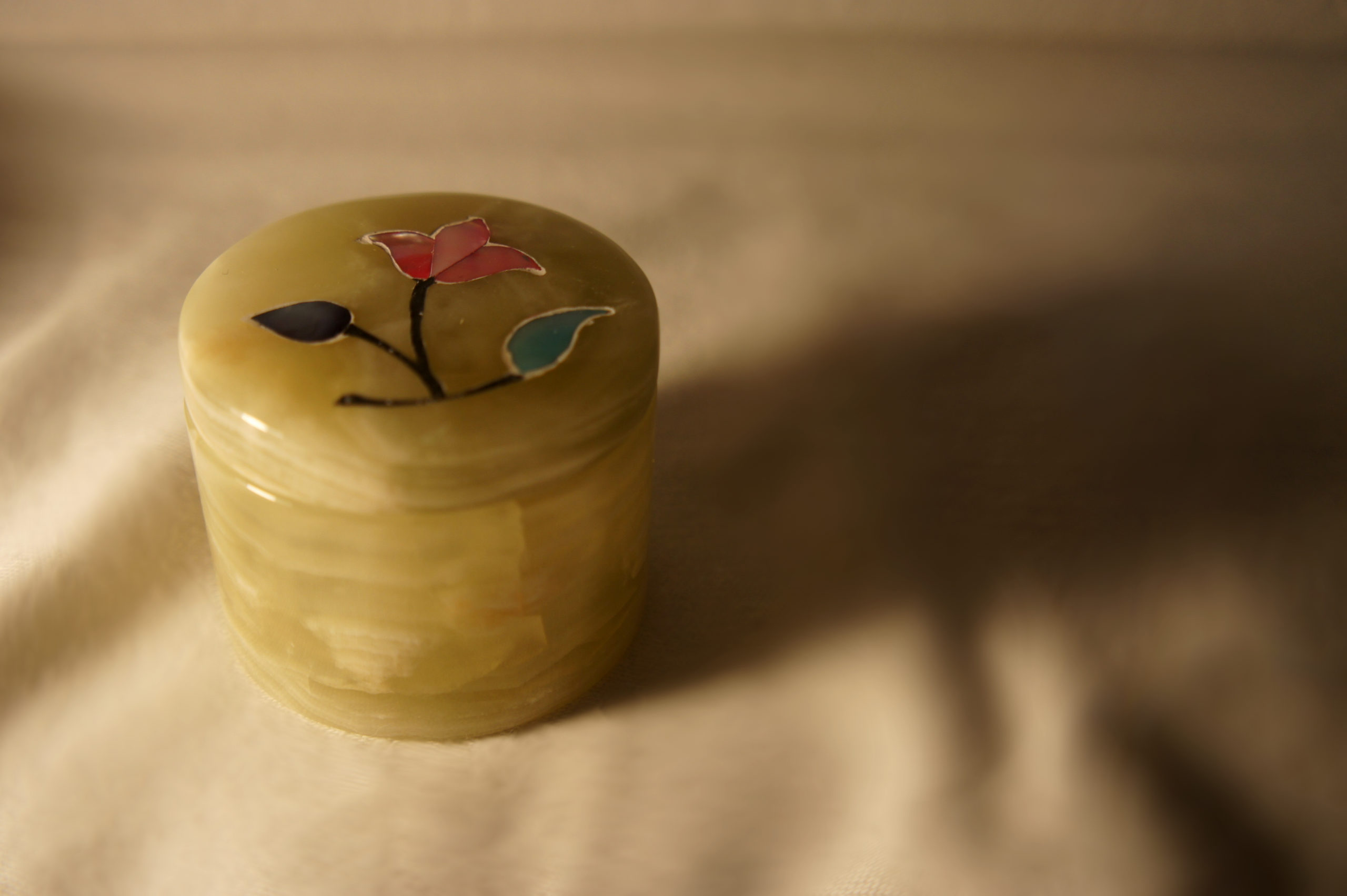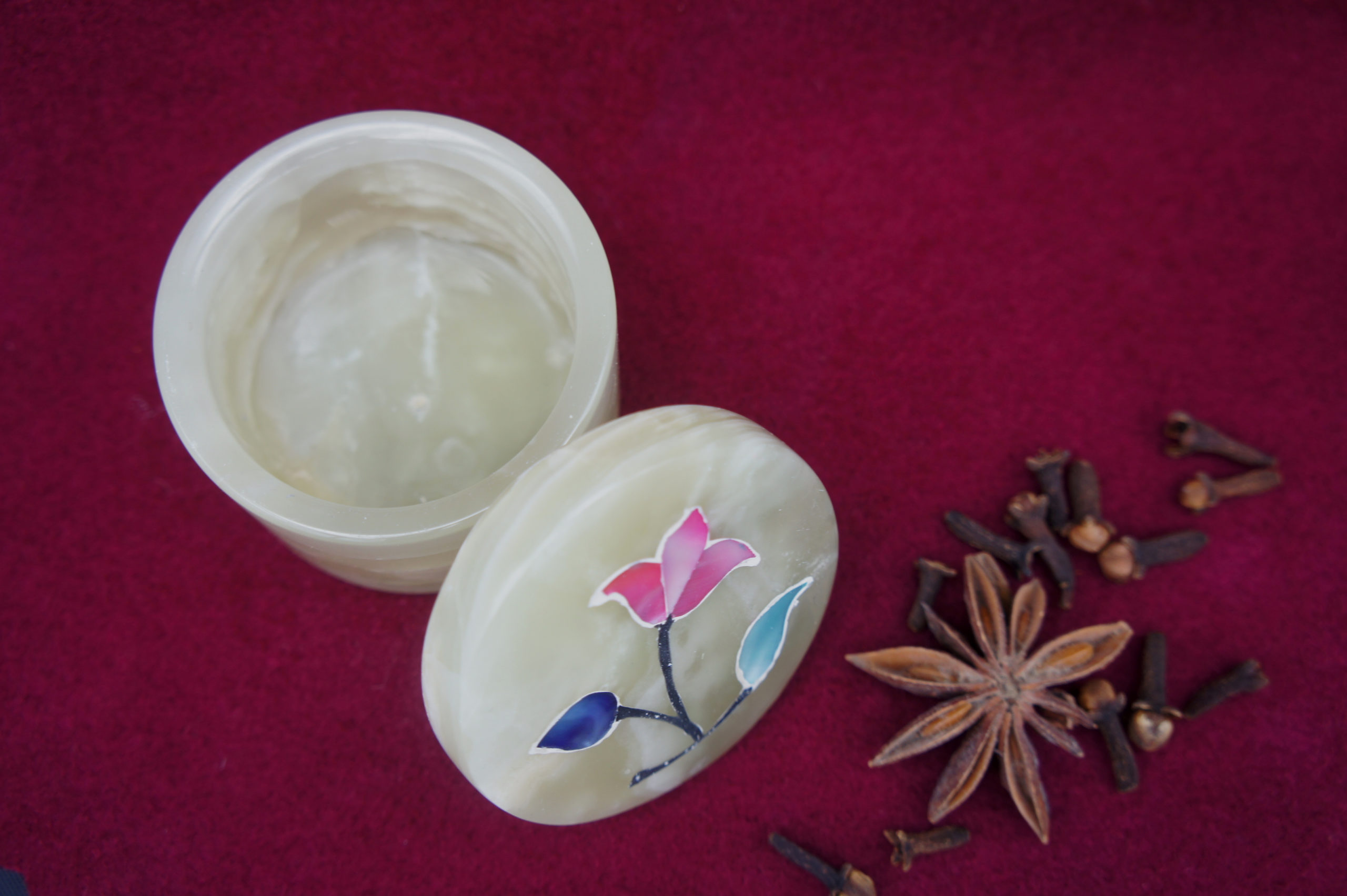 Dekoratives Behältnis aus Onyxmarmor (Aragonit-Calcit) mit Blumen-Design aus Perlmutt; für die Aufbewahrung von Schmuck, als Tisch-Deko oder für Gewürze geeignet.