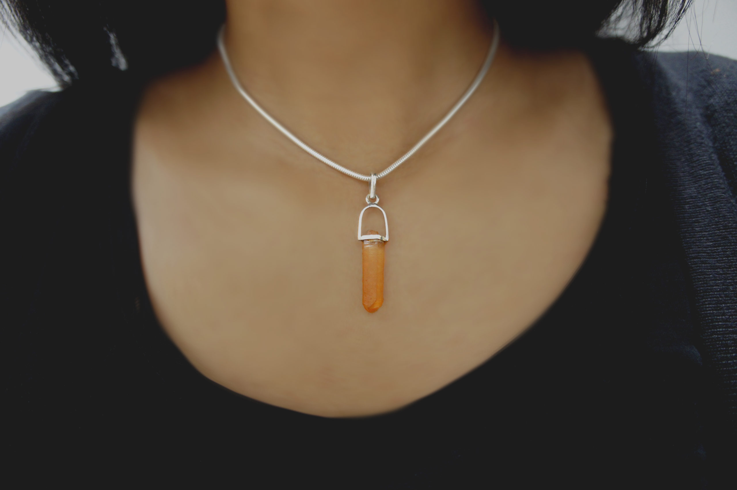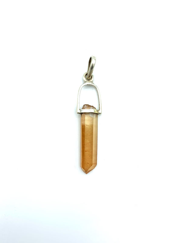 Wenn Bergkristall viel Eisen beinhaltet, bekommt dieser eine gelbe, orange oder sogar braune Farbe. Bei diesem Kristall handelt es sich um einen komplett naturbelassenen (d.h. ungeschliffenen, unpolierten) Hämatitquarz, der in eine minimalistische Silberfassung eingearbeitet wurde.