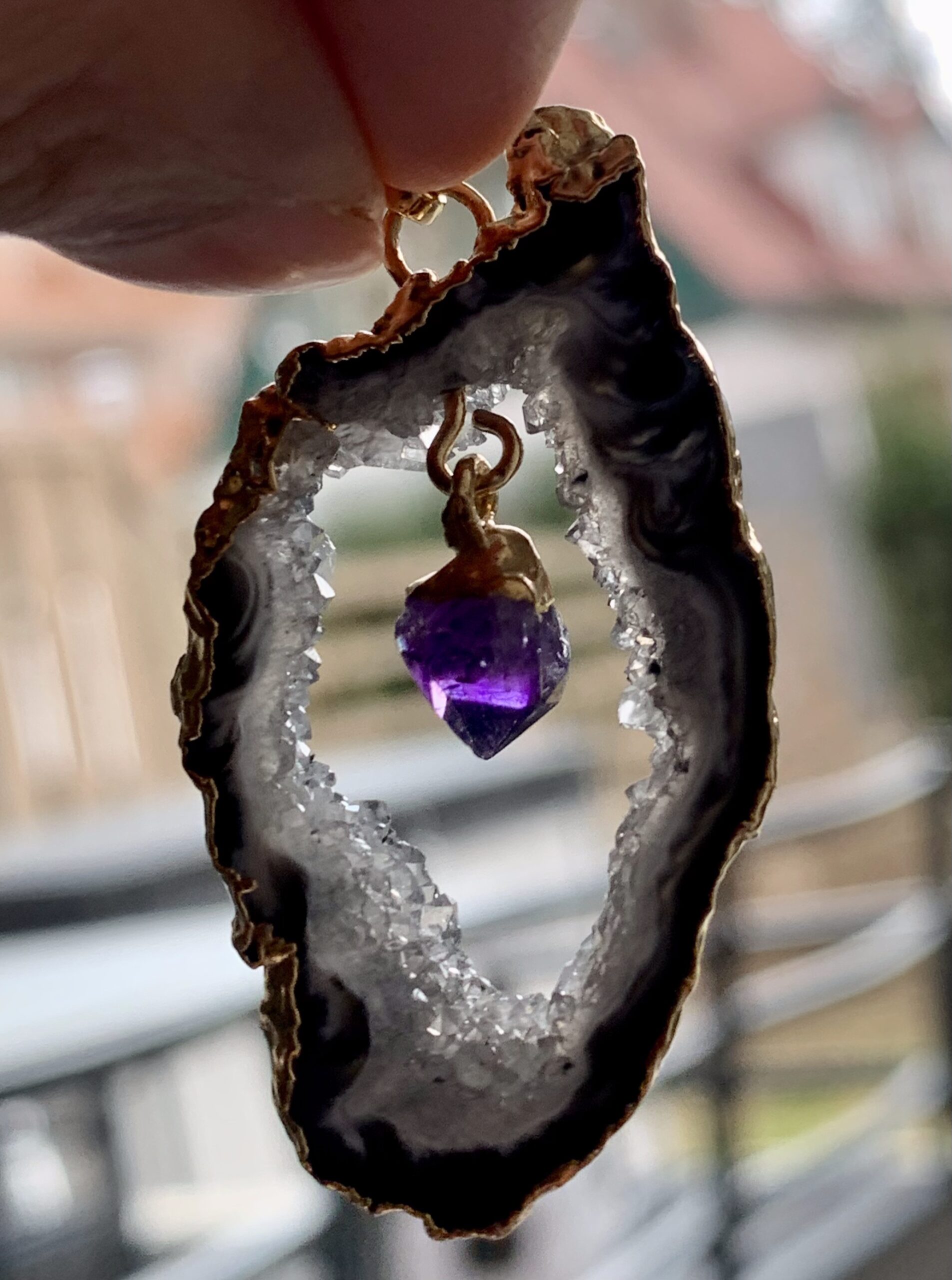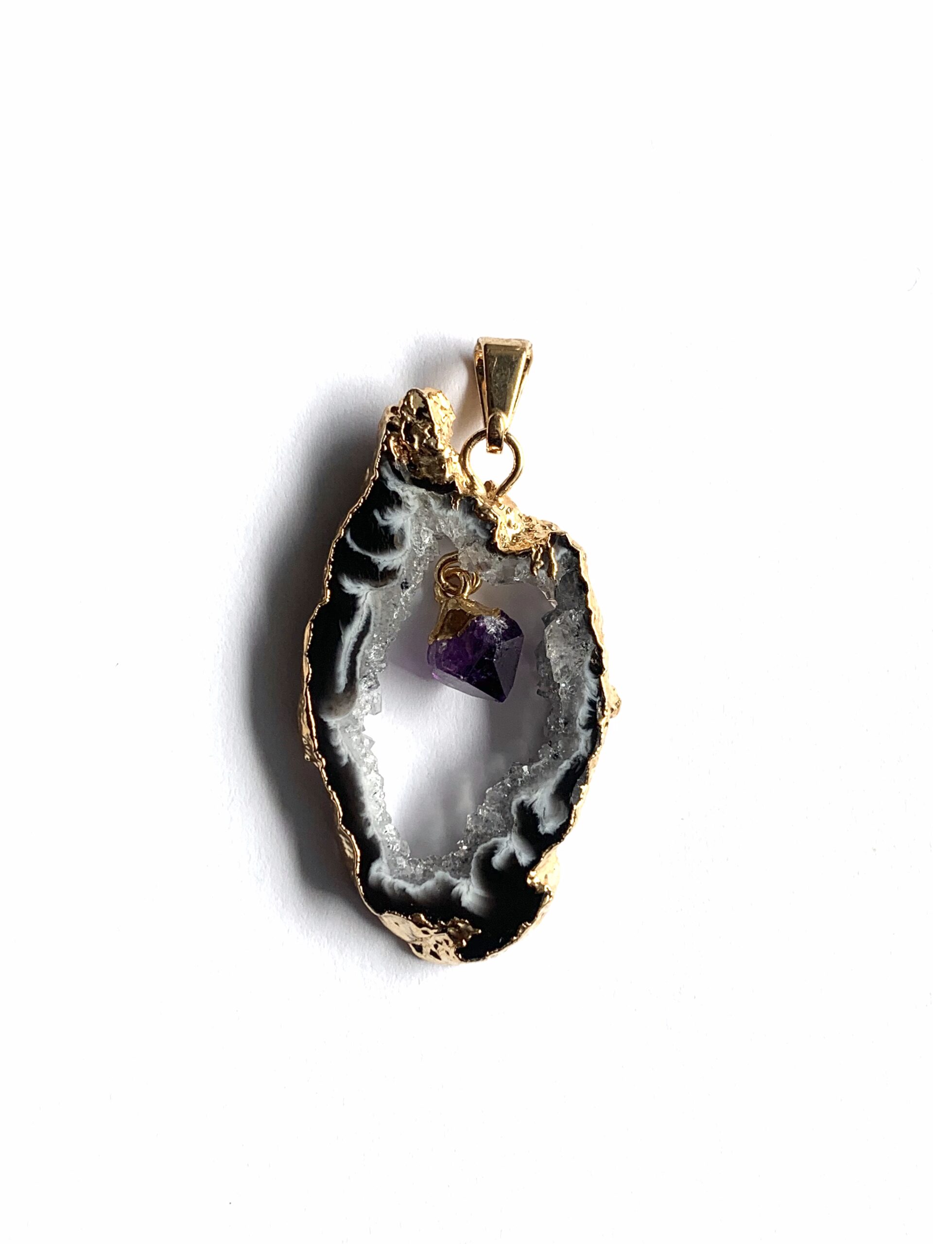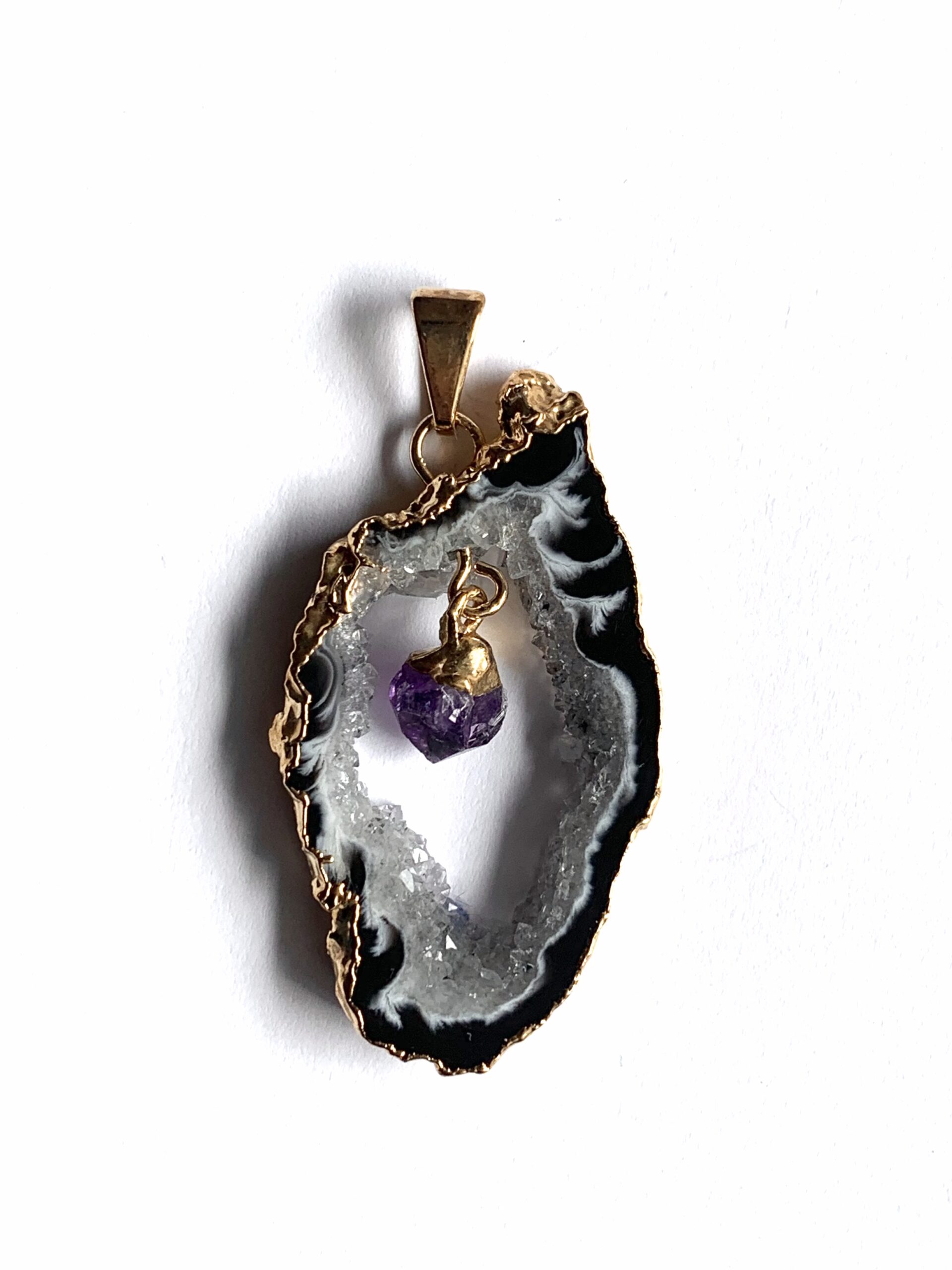 Naturbelassener Achat mit auskristallisierter Öffnung und weißer Maserung. In der Mitte hängt ein naturbelassener Amethyst-Kristall hoher Qualität. Der Anhänger ist nickelfrei.