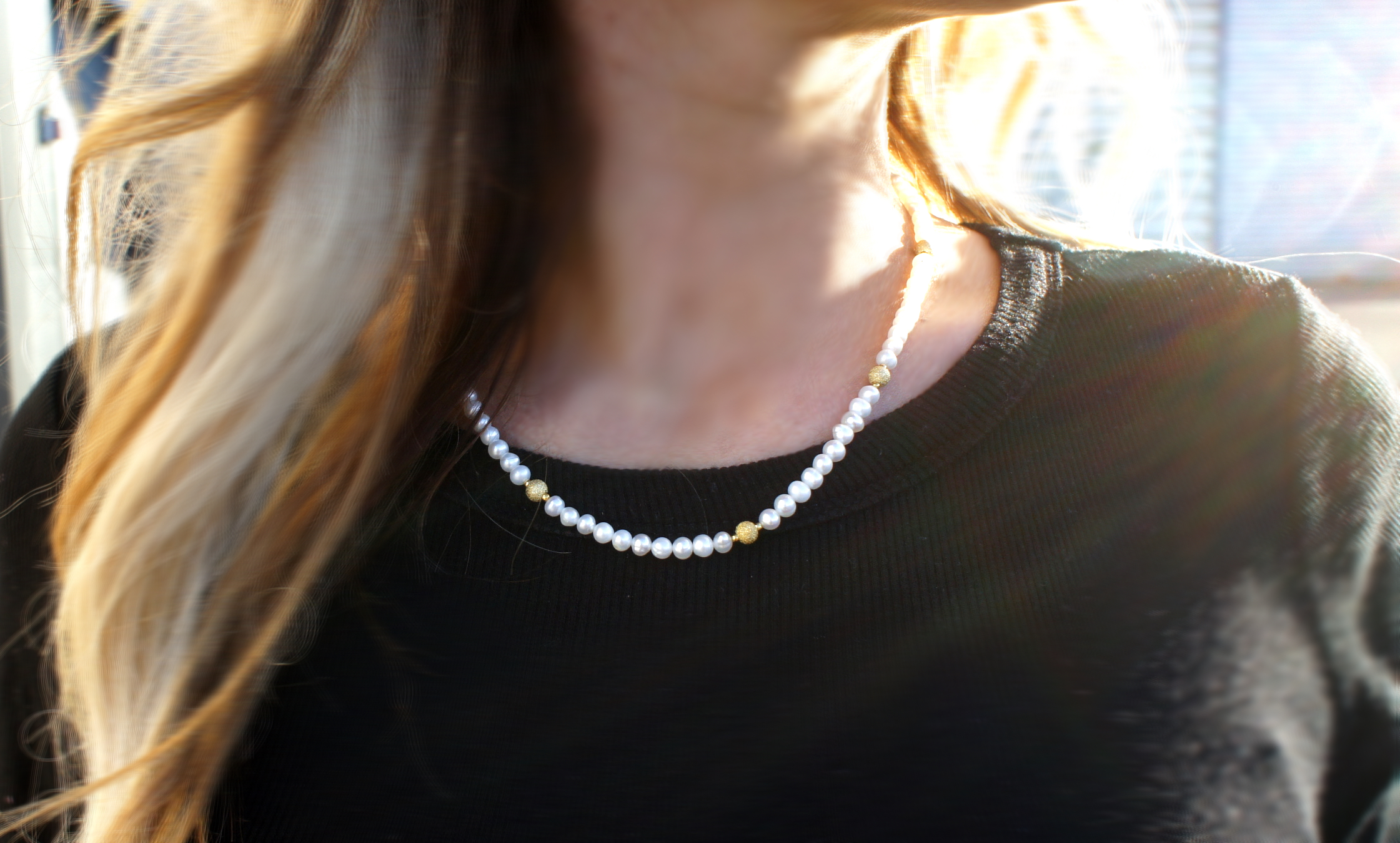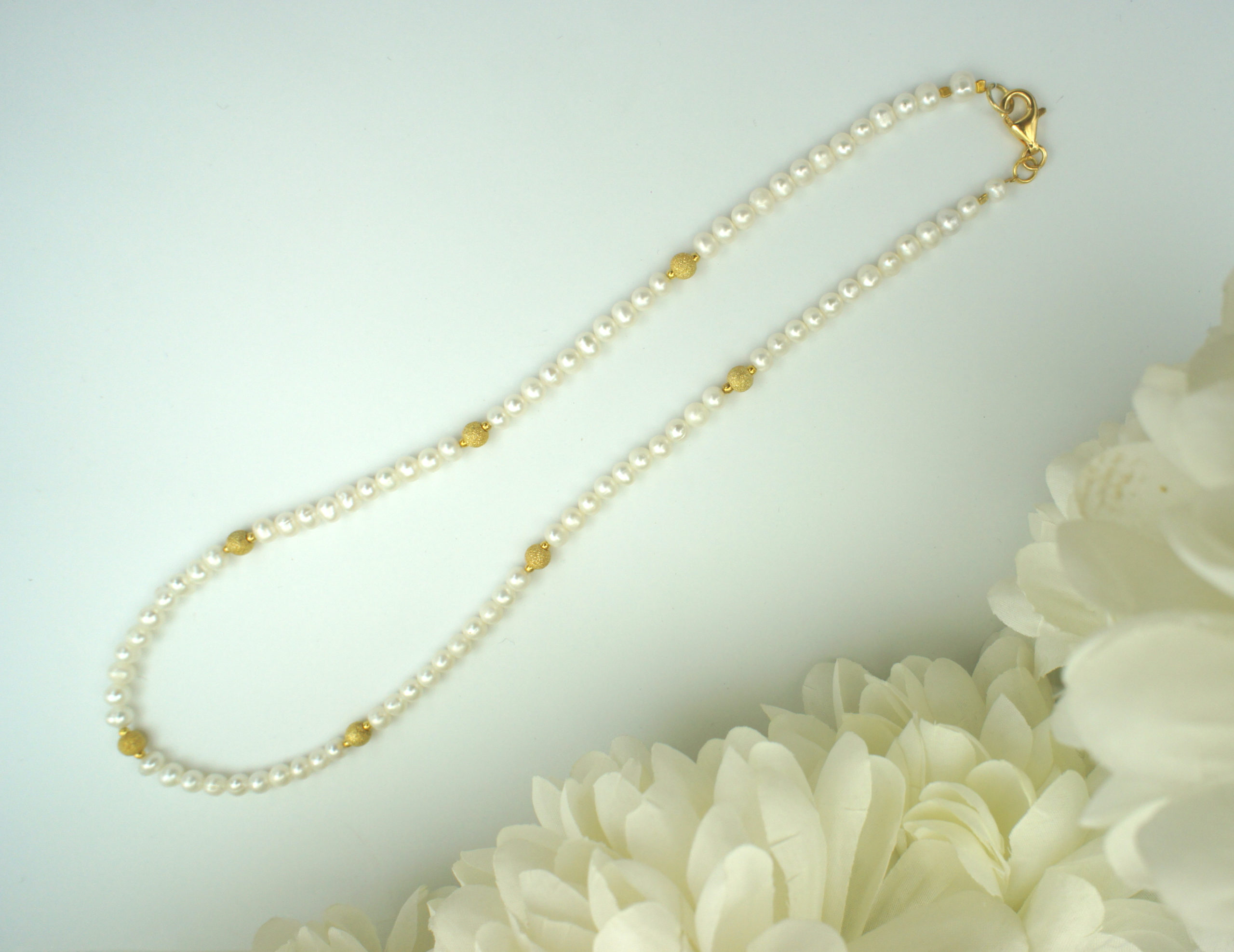 Perlenkette mit einem Hauch von Gold – sieht nicht nur elegant aus, sondern lässt sich auch wunderbar mit allen Farben kombinieren. Dazu passen schlichte Goldohrringe und ein zartes Goldarmband. ♥